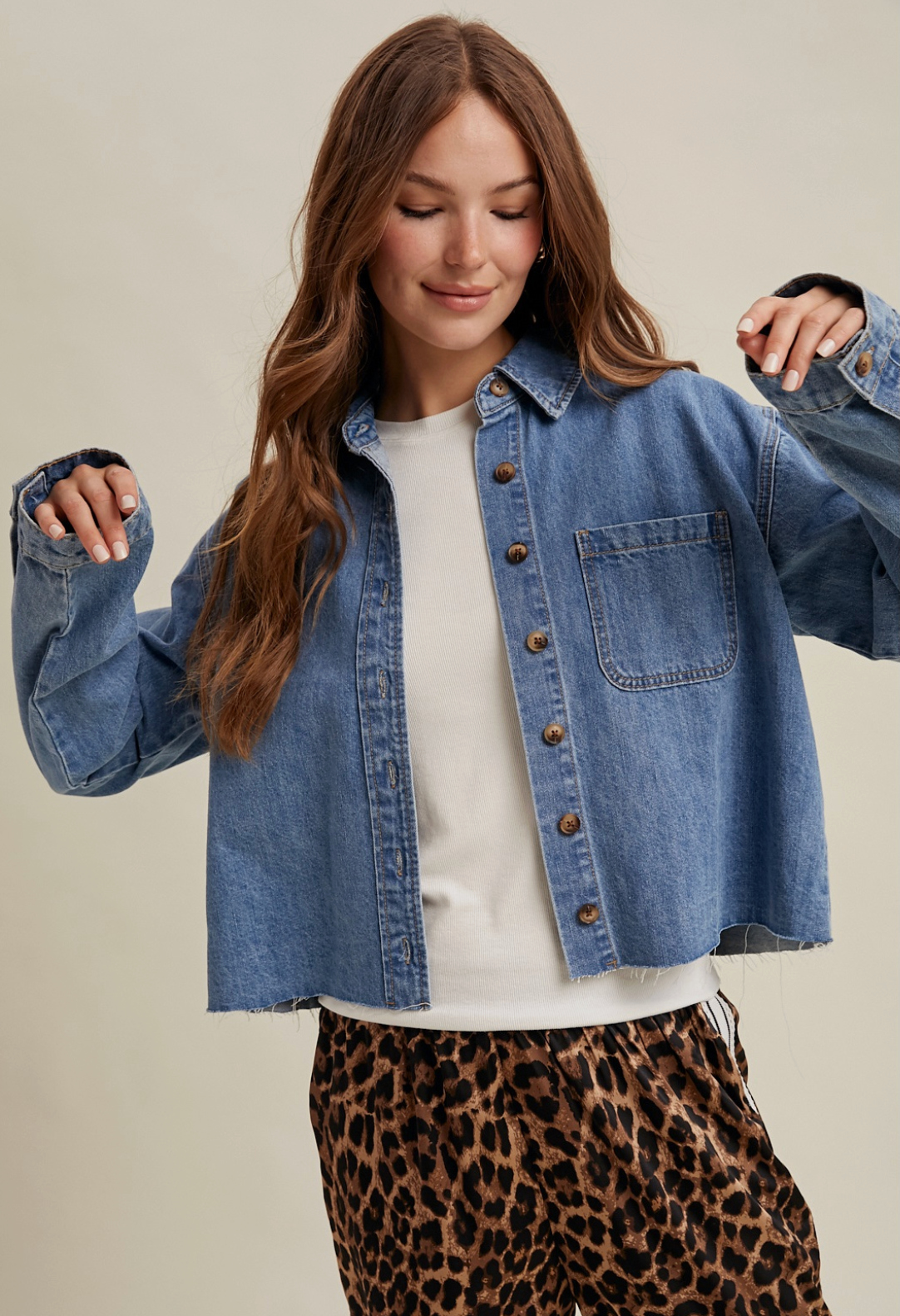 This button-up denim shirt features a raw edge for a rugged, edgy look. Crafted from durable denim with a timeless design, it’s perfect for creating a classic aspect to any outfit. - FUNCTIONAL BUTTONS