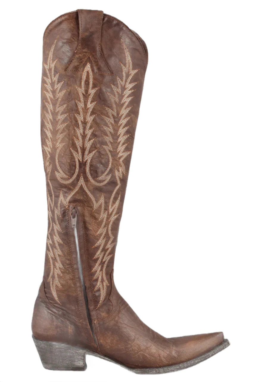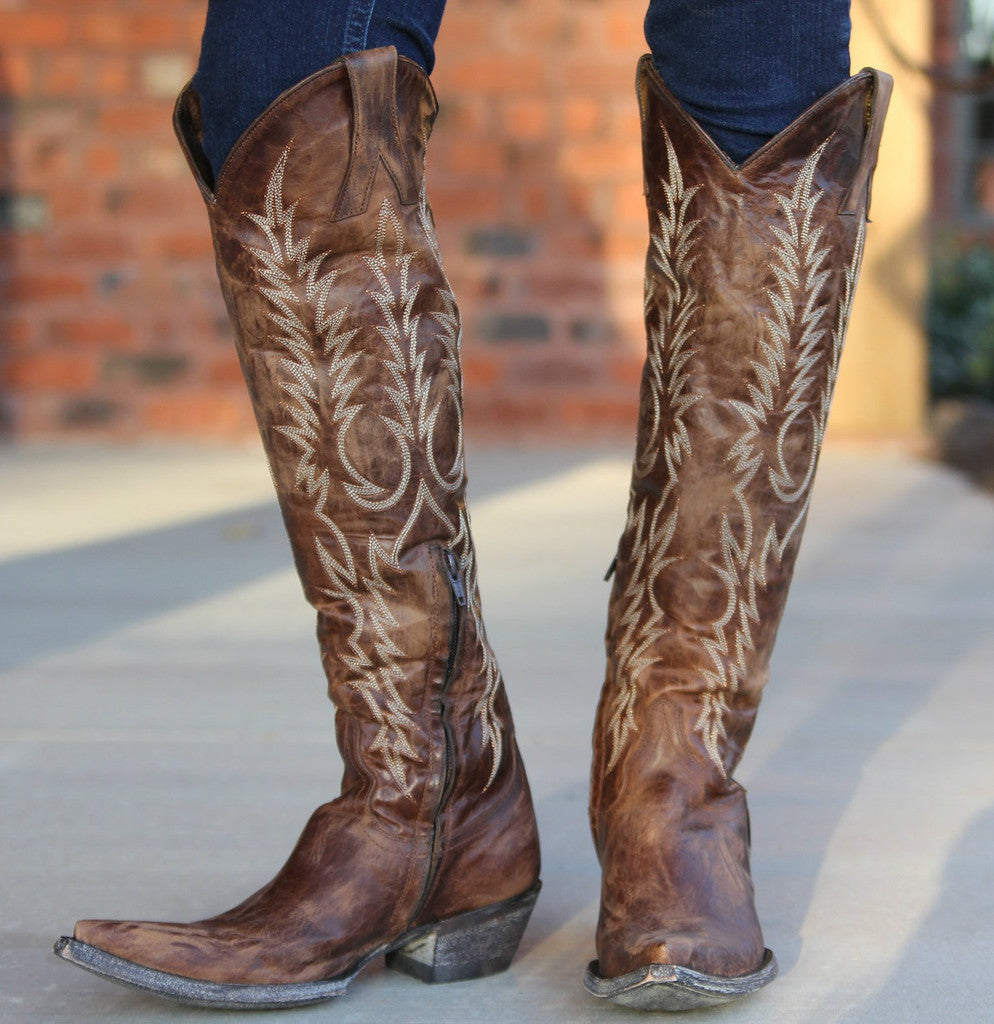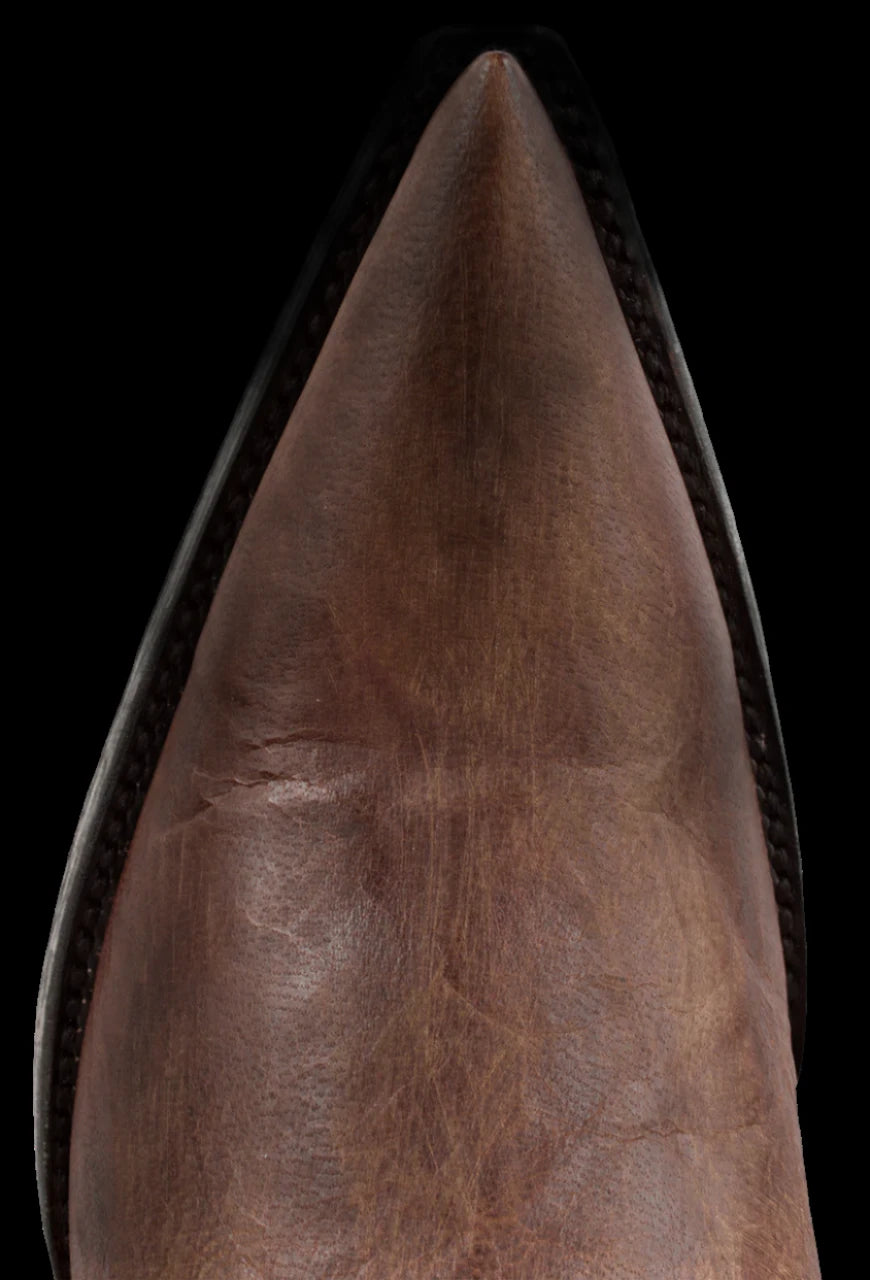Timeless & Tall - The Mayra in Brass is a must-have pair. Western stitching on the shaft balanced with a pointed toe, for a more fashion forward look.