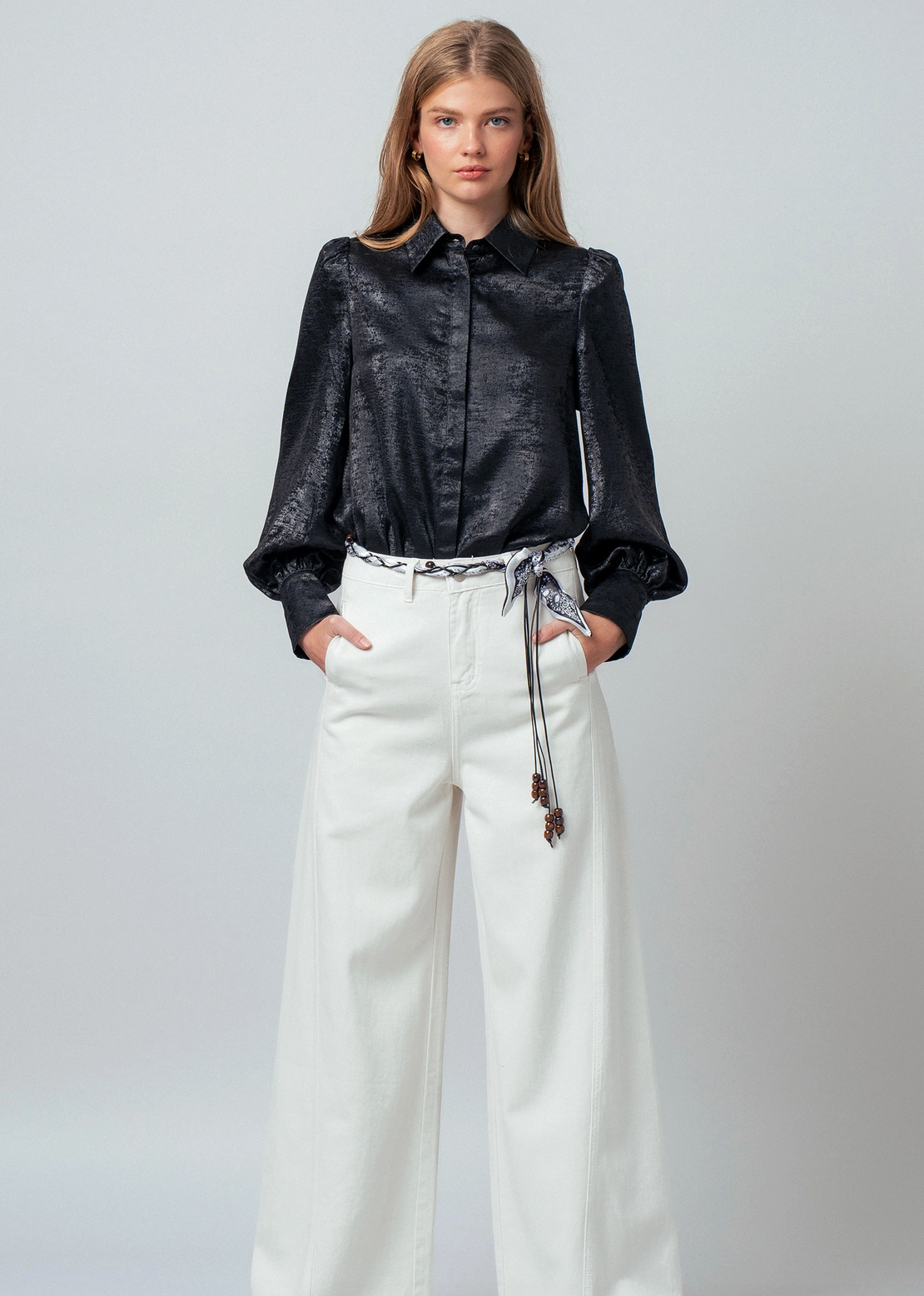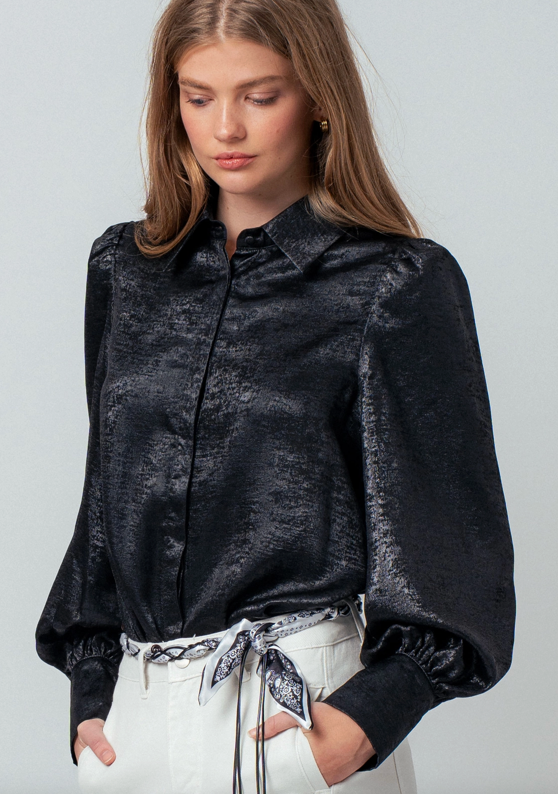 Make a shimmering statement with this textured Black bronze metallic blouse. Designed to bring effortless glamour to any holiday or evening look, its lustrous fabric catches the light beautifully. The classic button-down silhouette is elevated with dramatic puff sleeves, creating a chic and festive piece. Material: 100%polyester Design: Classic button-down front with a polished collar Fit: Relaxed silhouette for elegant draping Details: Features statement puff sleeves and wide buttoned cuffs