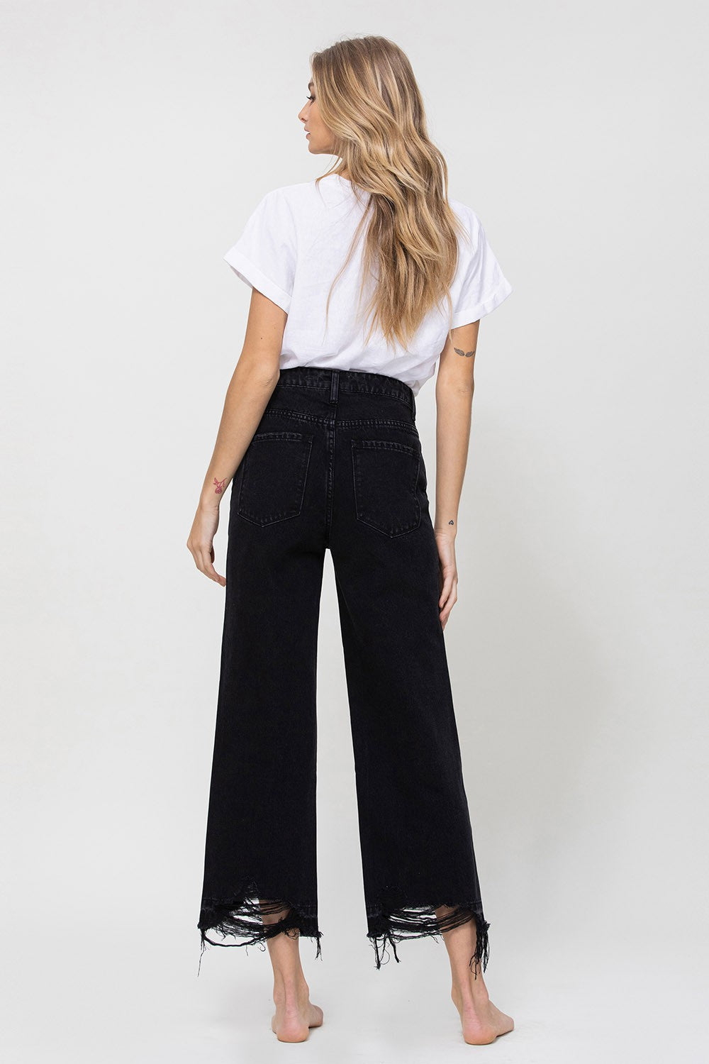 - Non stretch denim, super high waisted, released hemline, wide leg jean, black denim