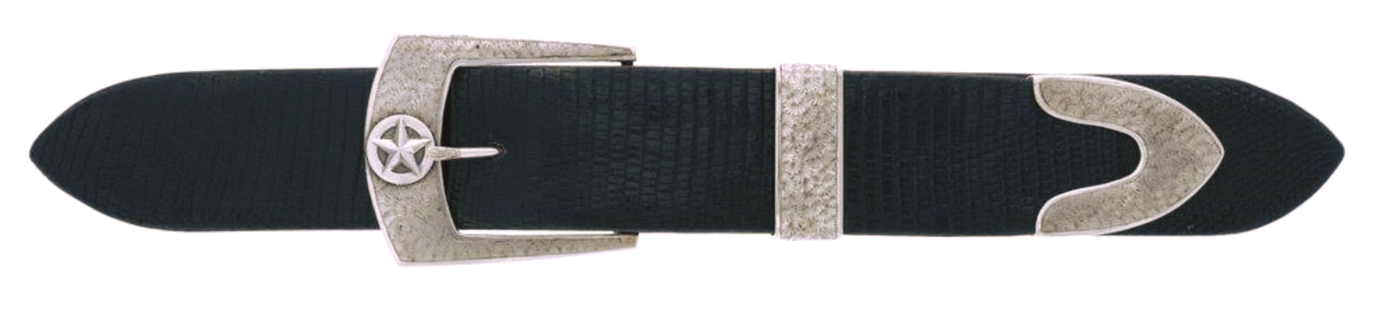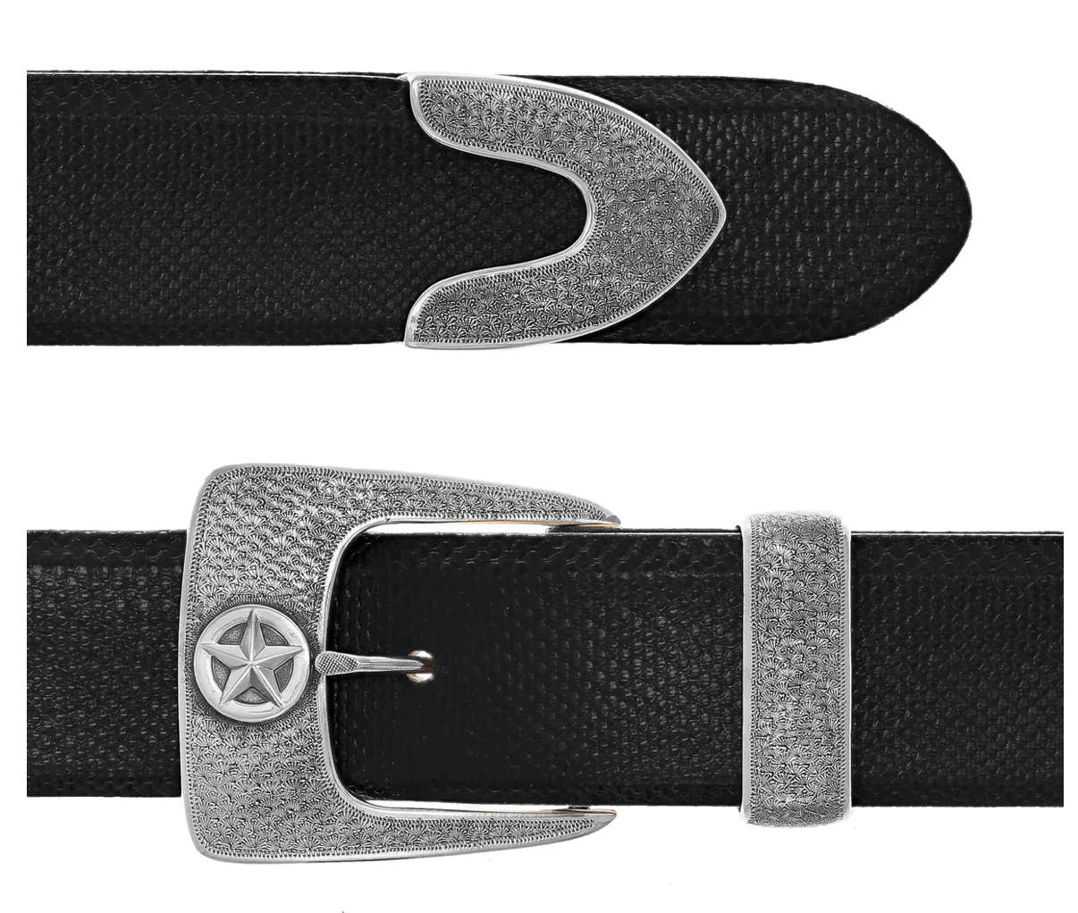 1-1/2" three piece sterling silver buckle set with sterling silver star on buckle and wheat grass engraving. Made and engraved by hand in Texas by Clint Orms Engravers & Silversmiths