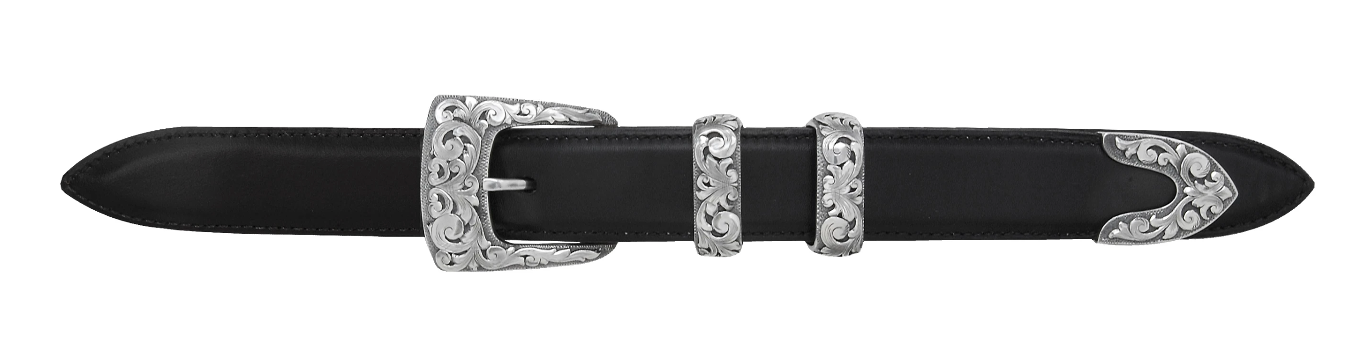 The four-piece Clay 1820 Sterling Silver Buckle Set from Clint Orms Engravers & Silversmiths is made with hand cut overlays, and each narrow loop is 1” in diameter. Each piece of this stunning sterling silver buckle set is handmade, engraved and delicately designed to create a unique look. Wear this dress buckle set for a special occasion, or use it to dress up a more casual look. Colors may vary due to screen resolution.