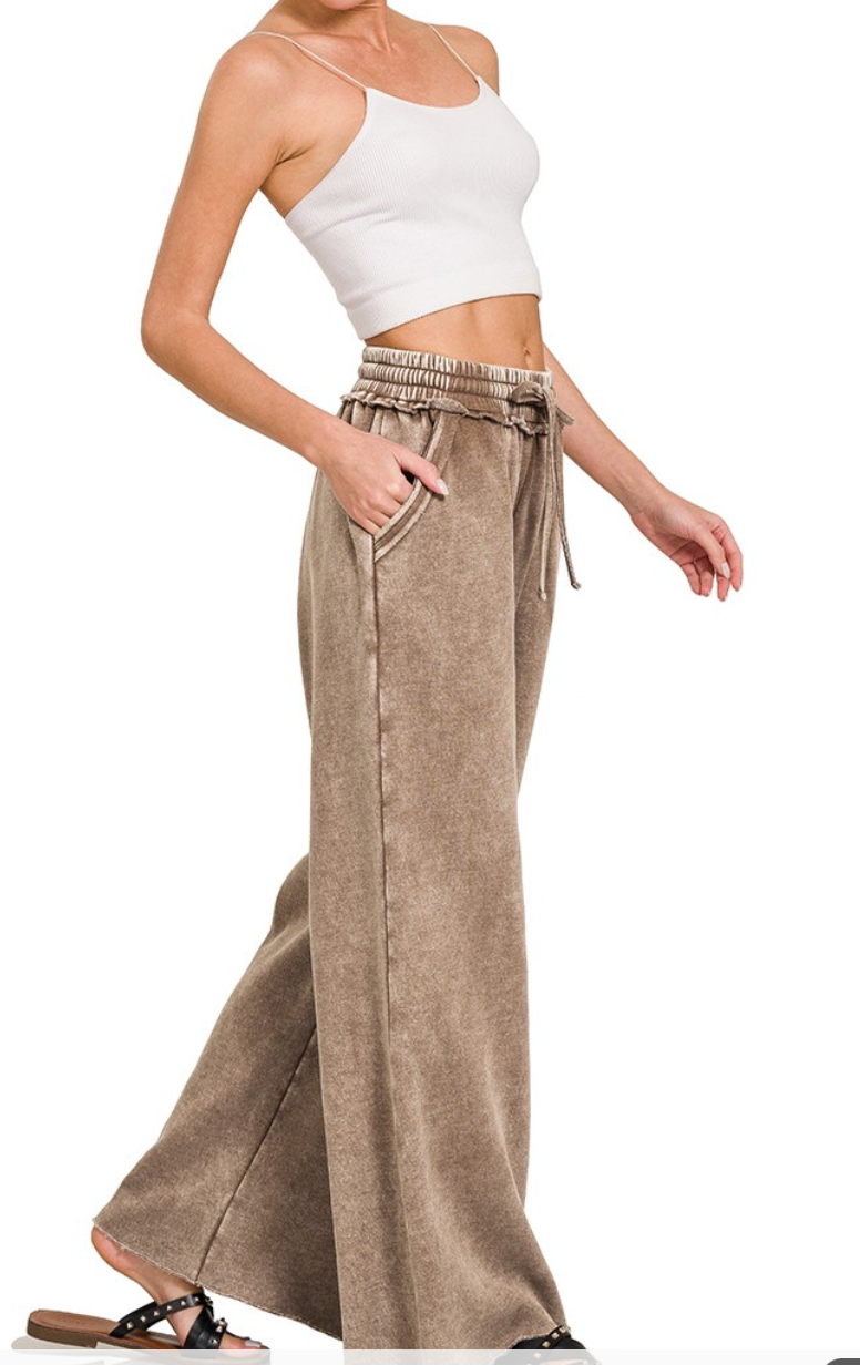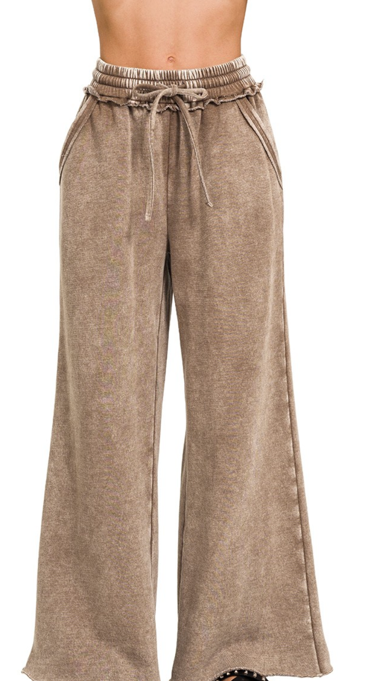 ACID WASH FLEECE PALAZZO SWEATPANTS WITH POCKETS - DRAWSTRING BAND WAIST - POCKETS - RAW HEM **Each item is unique, expect variations in color and finishing TOTAL WAIST: 25", INSEAM: 30" approx. - MEASURED FROM SMALL * COLOR MAY VARY SLIGHTLY DUE TO MONITOR RESOLUTION