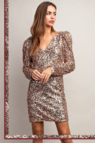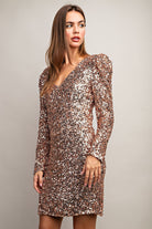 Long sleeve sequin mini dress featuring a slightly fitted body, a zipper closure in the back for added comfort and a v-neckline.