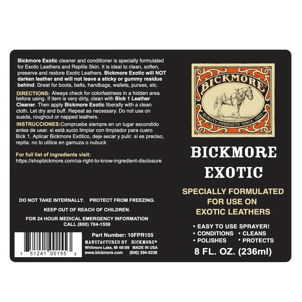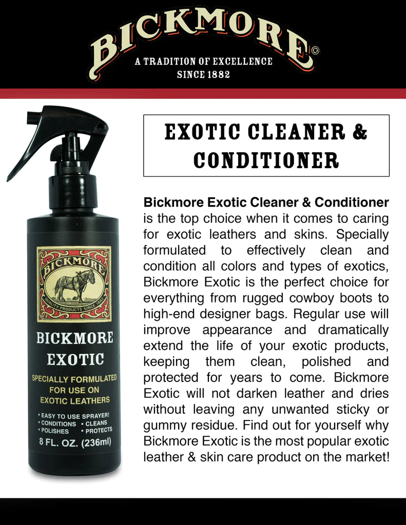 SPECIALLY FORMULATED FOR EXOTIC LEATHERS AND REPTILE SKIN: The special ingredients found in Bickmore Exotic are hand-picked to provide your exotic leathers and reptile skins with the utmost care they deserve.