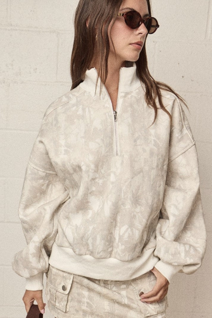 CAMO ZIP UP COLLARED SWEATER Stay cute and cozy in this oversized half-zip pullover!
