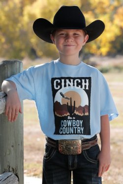 Dress him to ride out with the big guys wearing a comfortable cotton crew neck tee shirt with CINCH Cowboy Country front screen print. This all-season tee wears solo on warm days or layered under a denim jacket after dark.