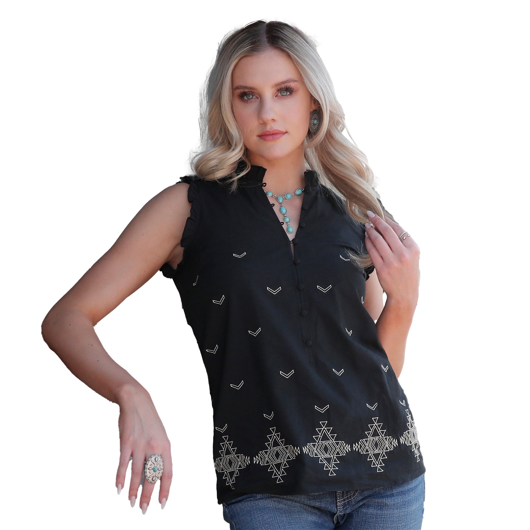 Fall in love with this beautiful aztec embroidered sleeveless blouse from Cruel. This black blouse has a lightweight feel and features a button front placket along with ruffled shoulders and ruffed neck. Saddle up in style with the Aztec Embroidered Sleeveless Blouse, a chic twist on Western charm for the modern cowgirl.