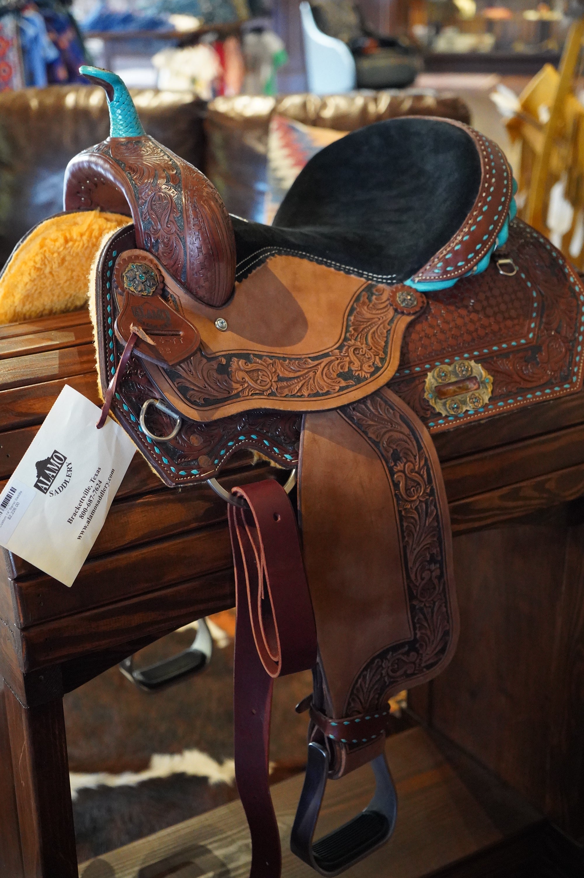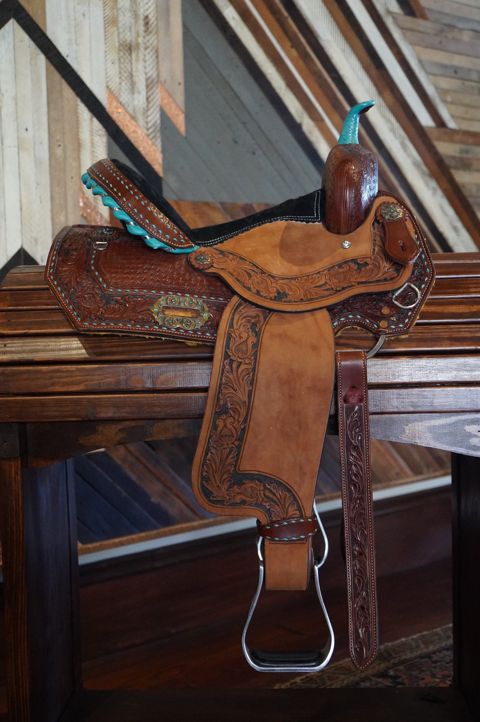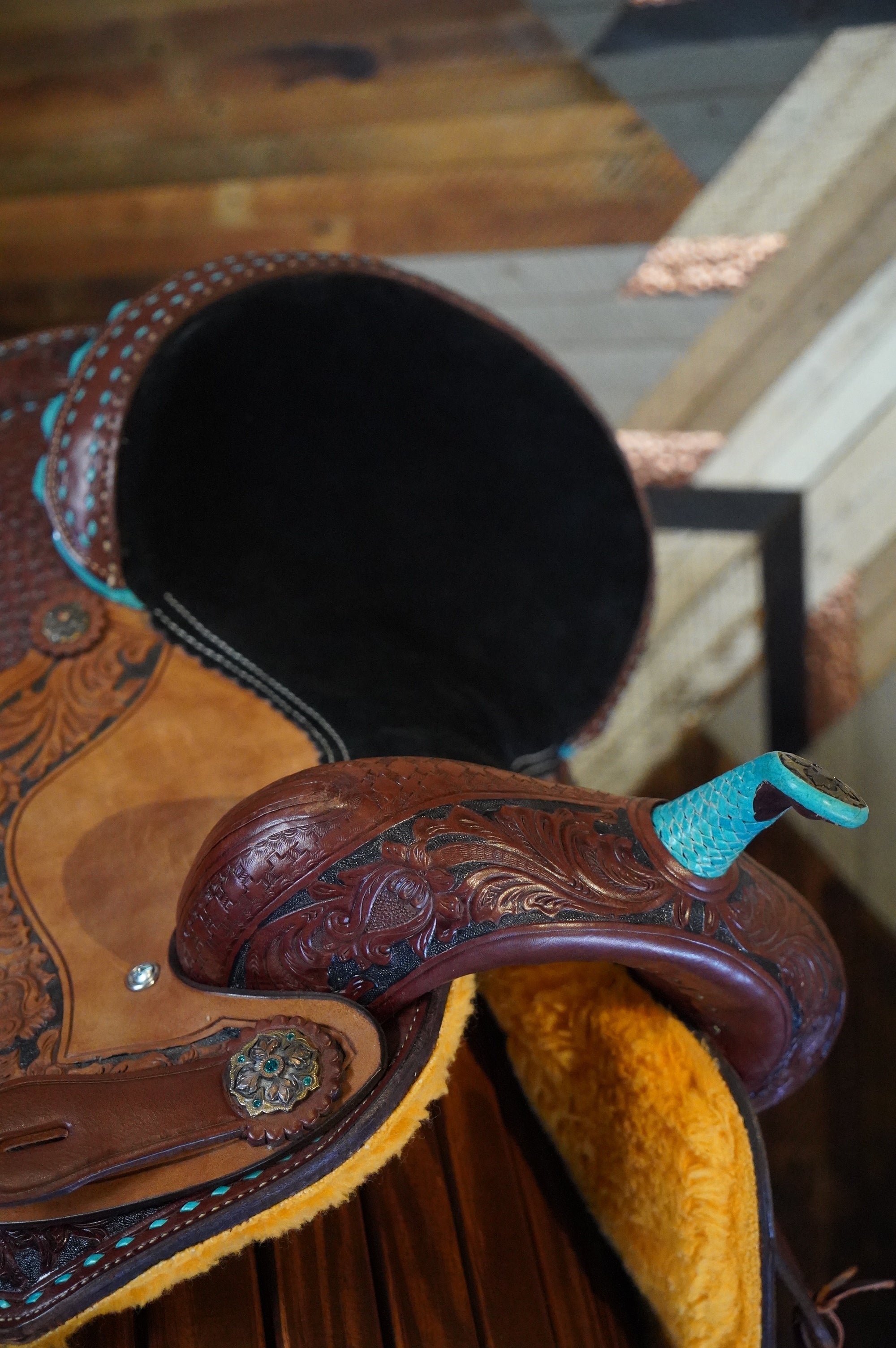 Hand picked and custom designed 14" barrel saddle. This saddle is covered in custom conchos and laced in turquoise buck stitch. This completely tooled barrel saddle with a turquoise saddle horn will set you apart from the rest!