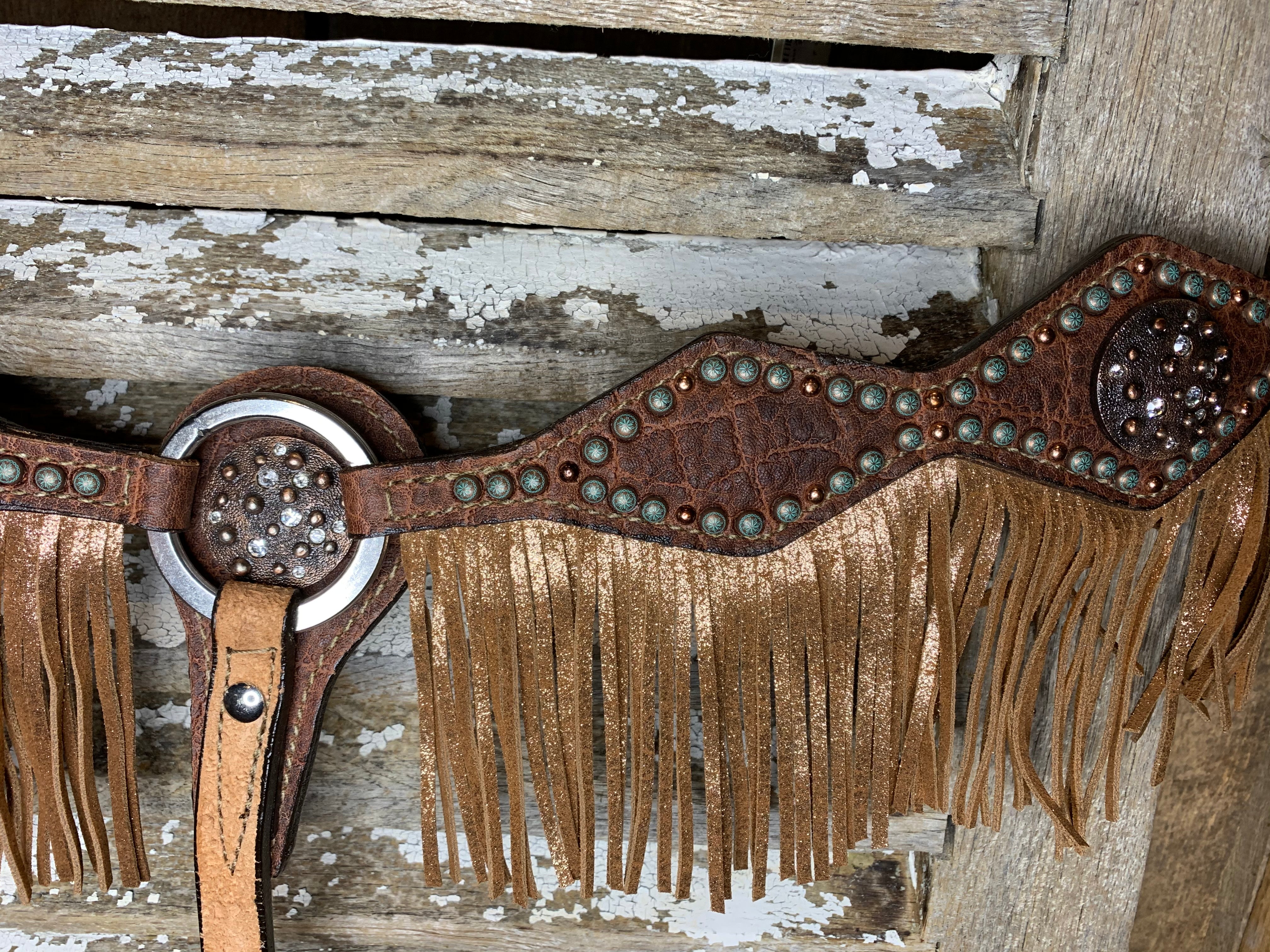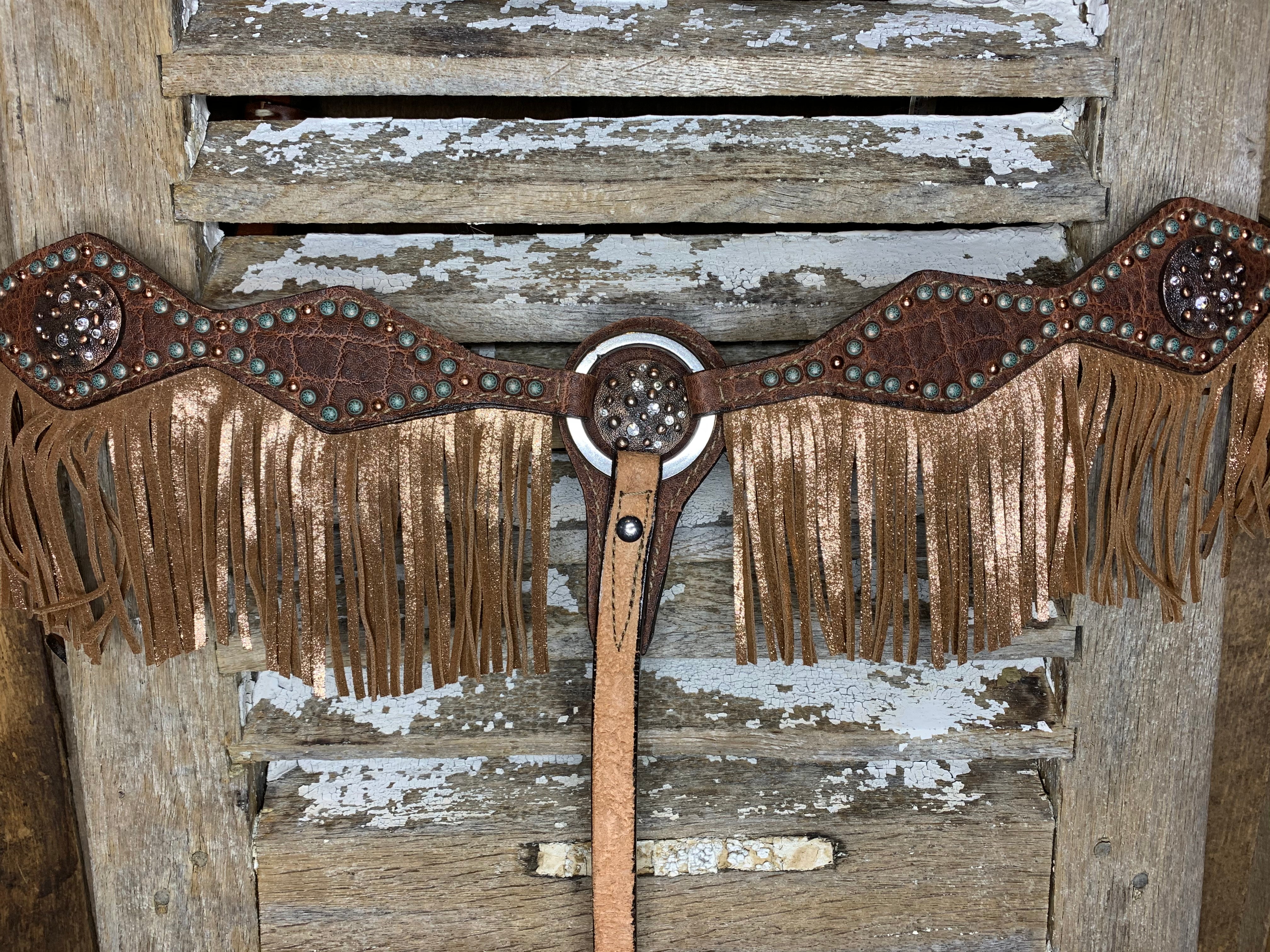 Diamond cut breast collar with redwood elephant overla, petina spotting, copper crackle fringe, and conchos.