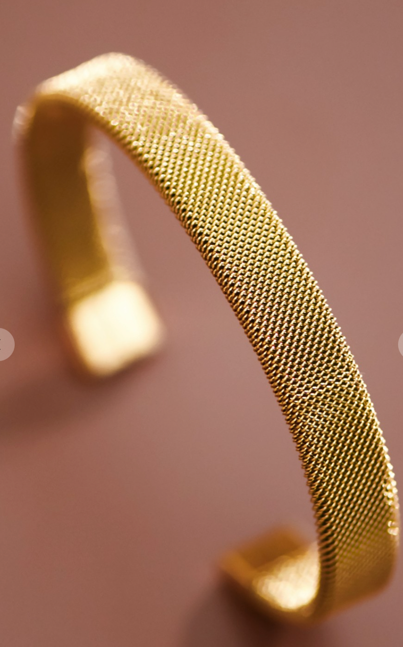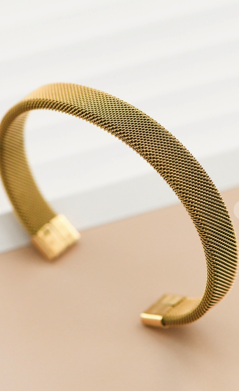 18K gold plated stainless steel cuff bangle bracelet. The bracelet is hypoallergenic, waterproof, fade-resistant, and tarnish-free,