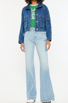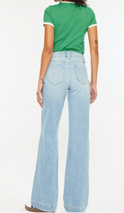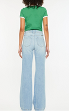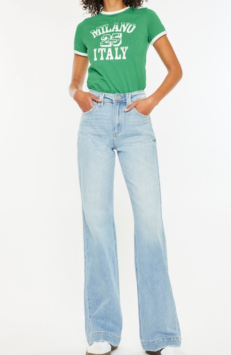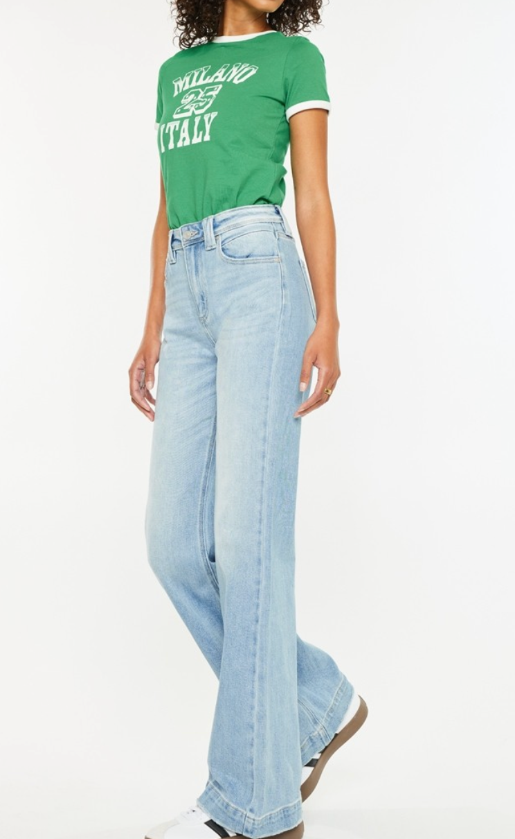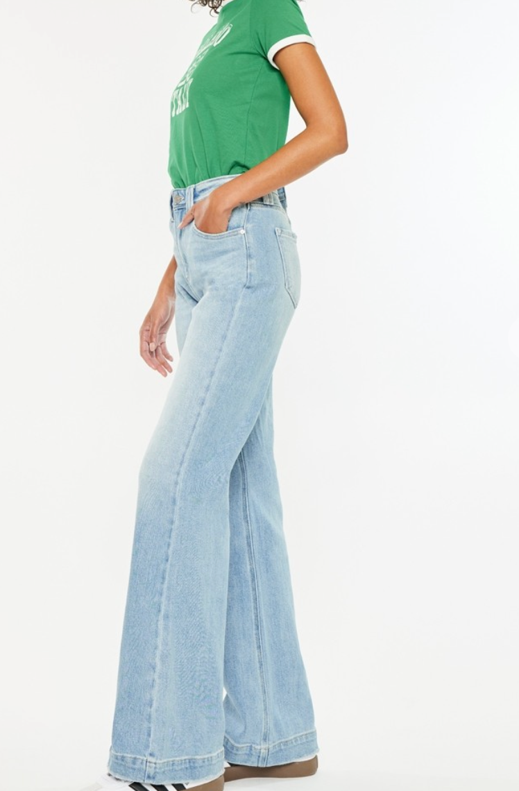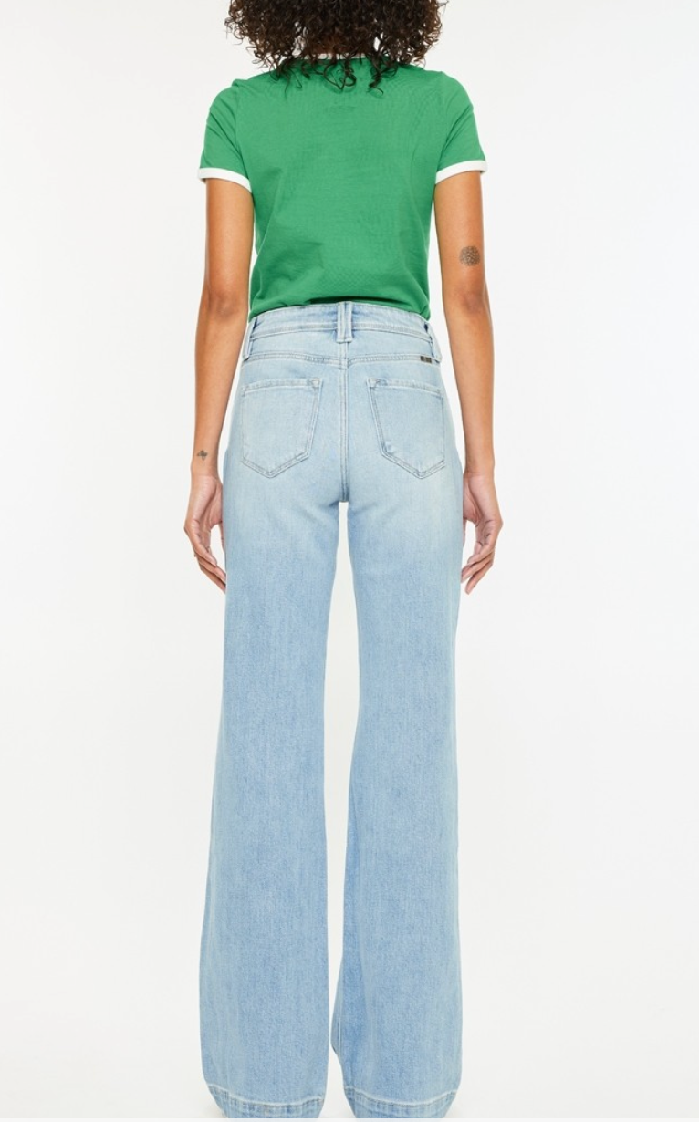 OPEN PACK HIGH RISE FLARE JEANS LIGHT WASH COMFORT STRETCH NON DISTRESSED DOUBLE BELT LOOP CUT SEAM AT FRONT POCKETS WIDE HEM RISE 11" INSEAM 34" IN SIZE 5/26 99% COTTON, 1% SPANDEX 13 OZ