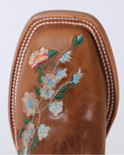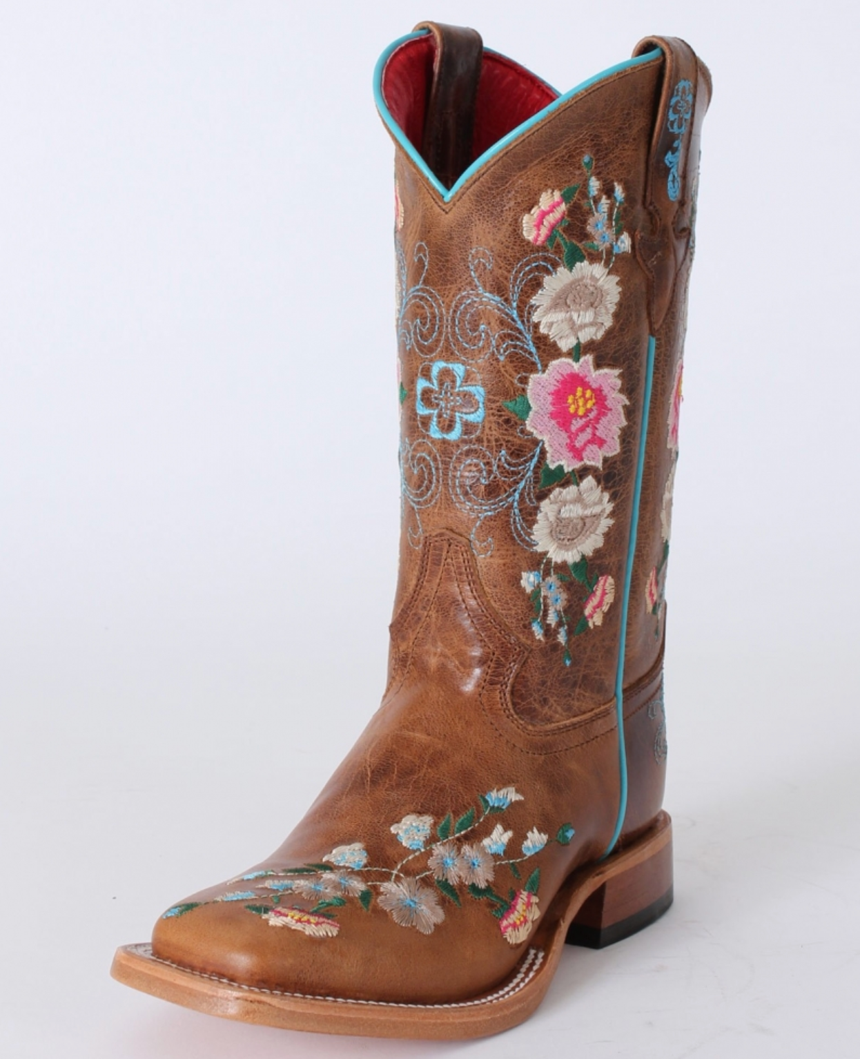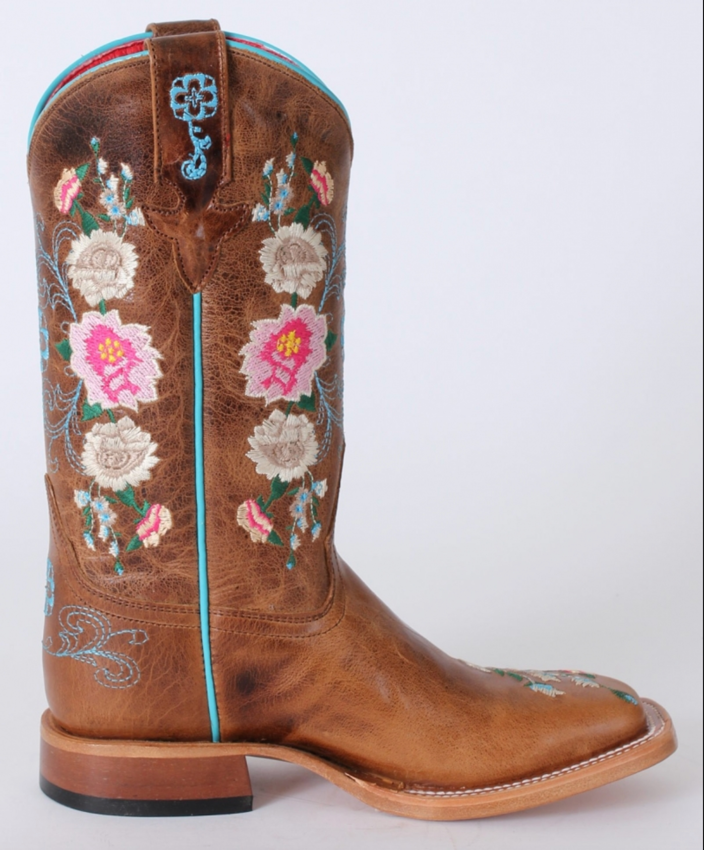 These adorable Anderson Bean® boots have a honey bunch top and vamp. The 9 " shaft has pull straps with embroidery, light blue piping and a multi-colored floral embroidery pattern which is also on the foot. They have a DB square toe, roper heel and leather sole. Made of leather. The shaft is based on a size 11 boot. Imported. Styles ending in T are toddler size and styles ending in Y are youth sizes.