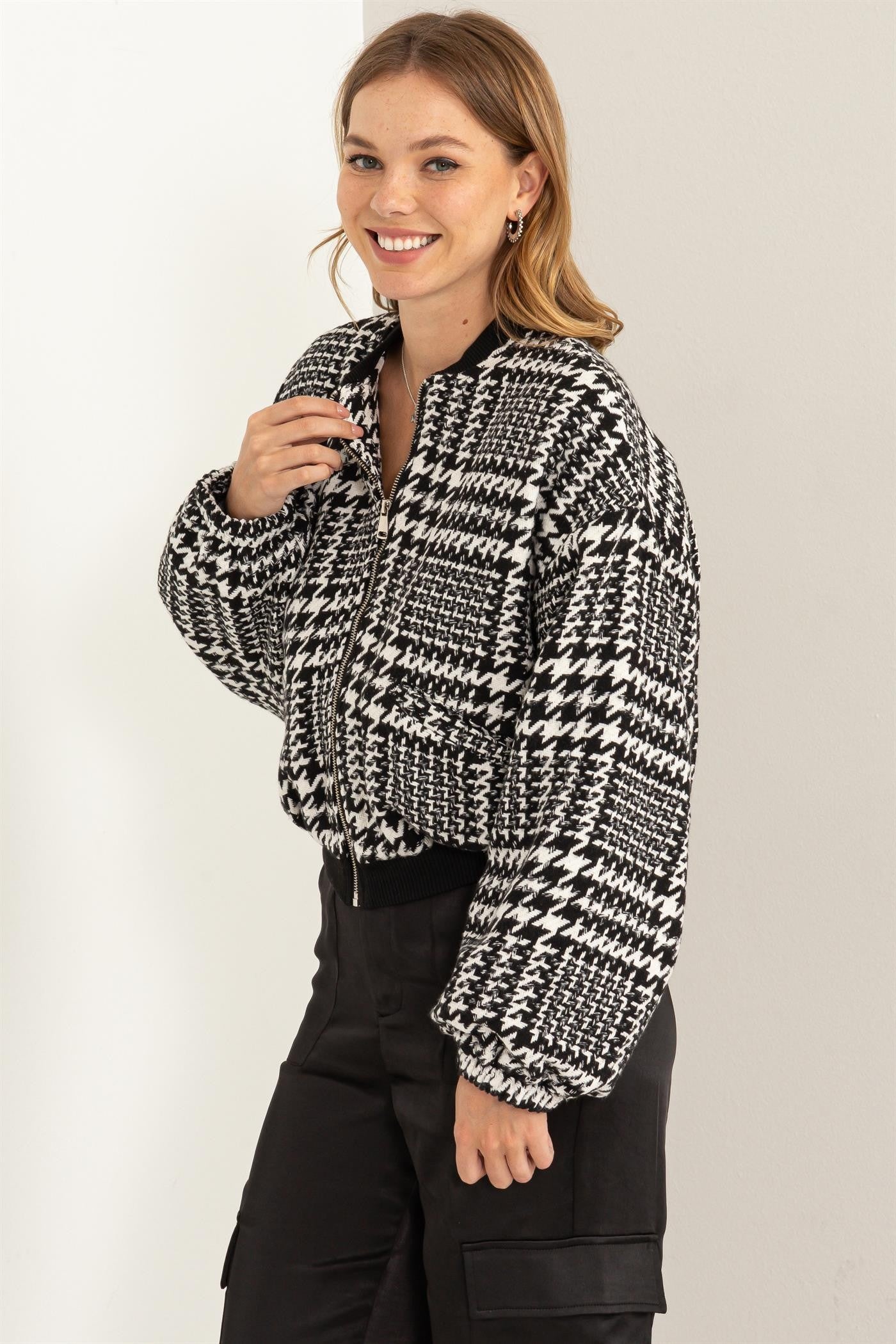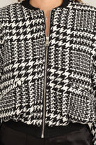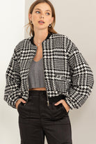 THIS BOMBER JACKET FEATURES A HOUNDSTOOTH PATTERN