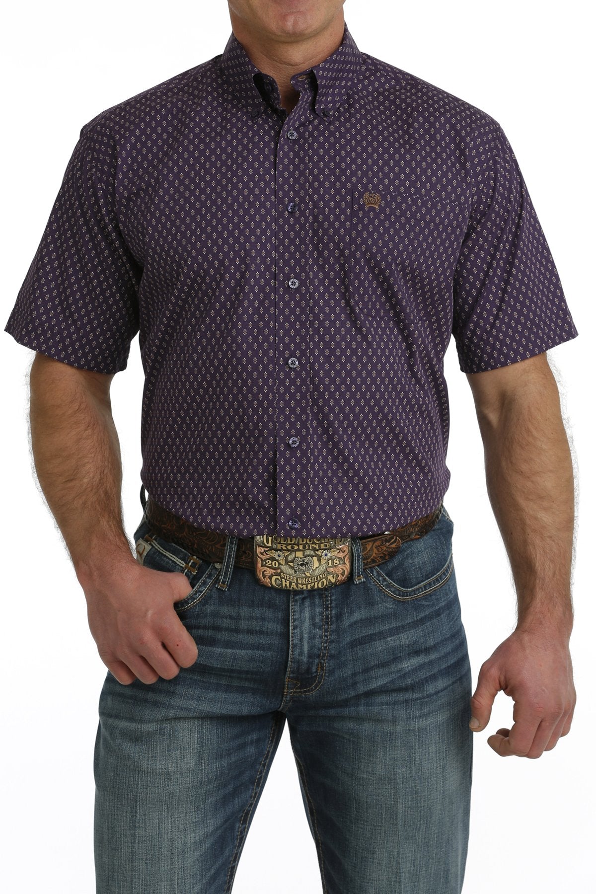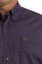 This classic purple printed button down by CINCH doesn't skimp on style or function. Comfortable cotton plain weave construction features an open left front pocket, embroidered logo and purple buttons.