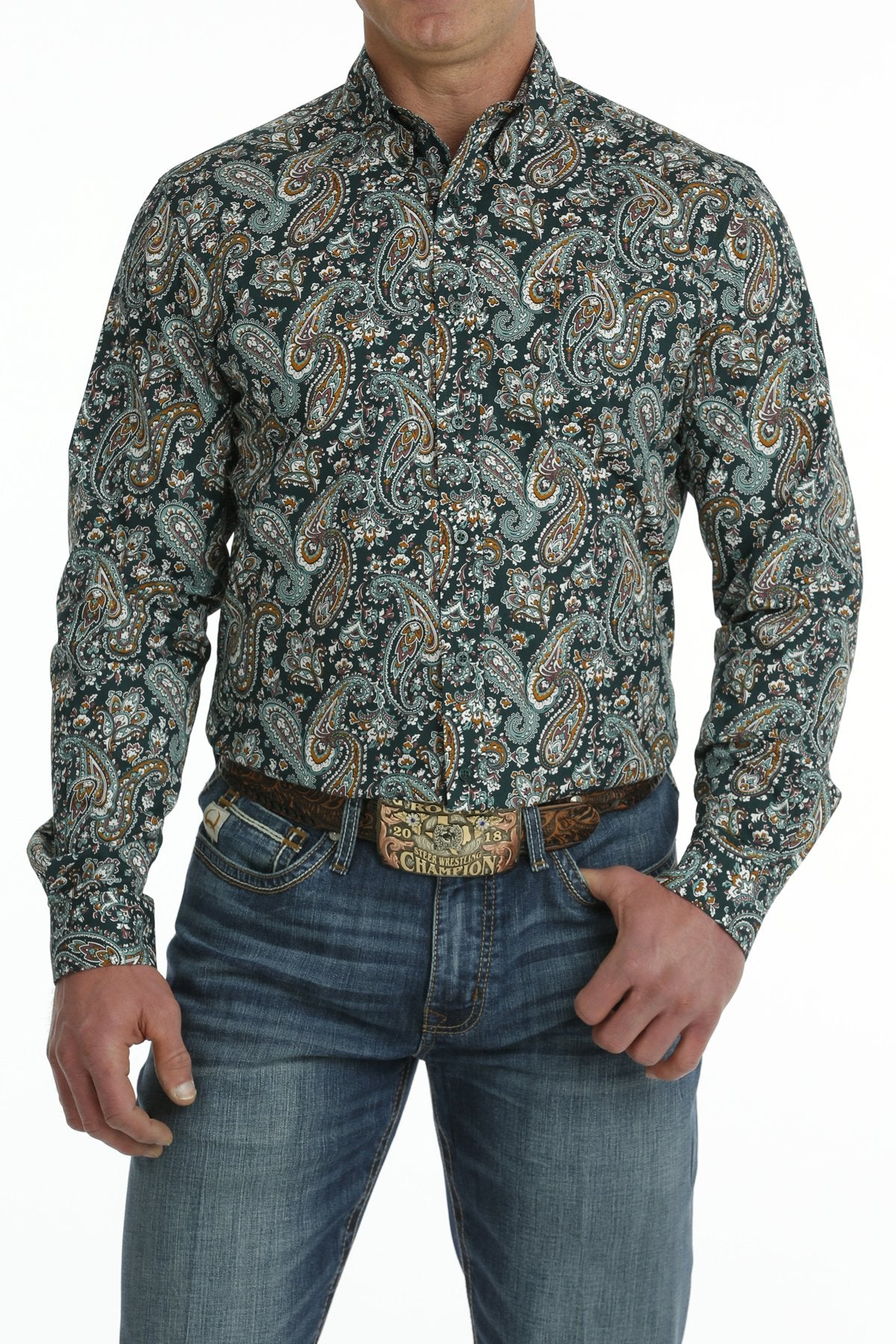 Engineered in a pattern with personality, this Modern Fit green paisley cotton plain weave is stylish, timeless, and the perfect match for new blue jeans. Design details include an open left front pocket, embroidered CINCH logo and green buttons. MODERN FIT