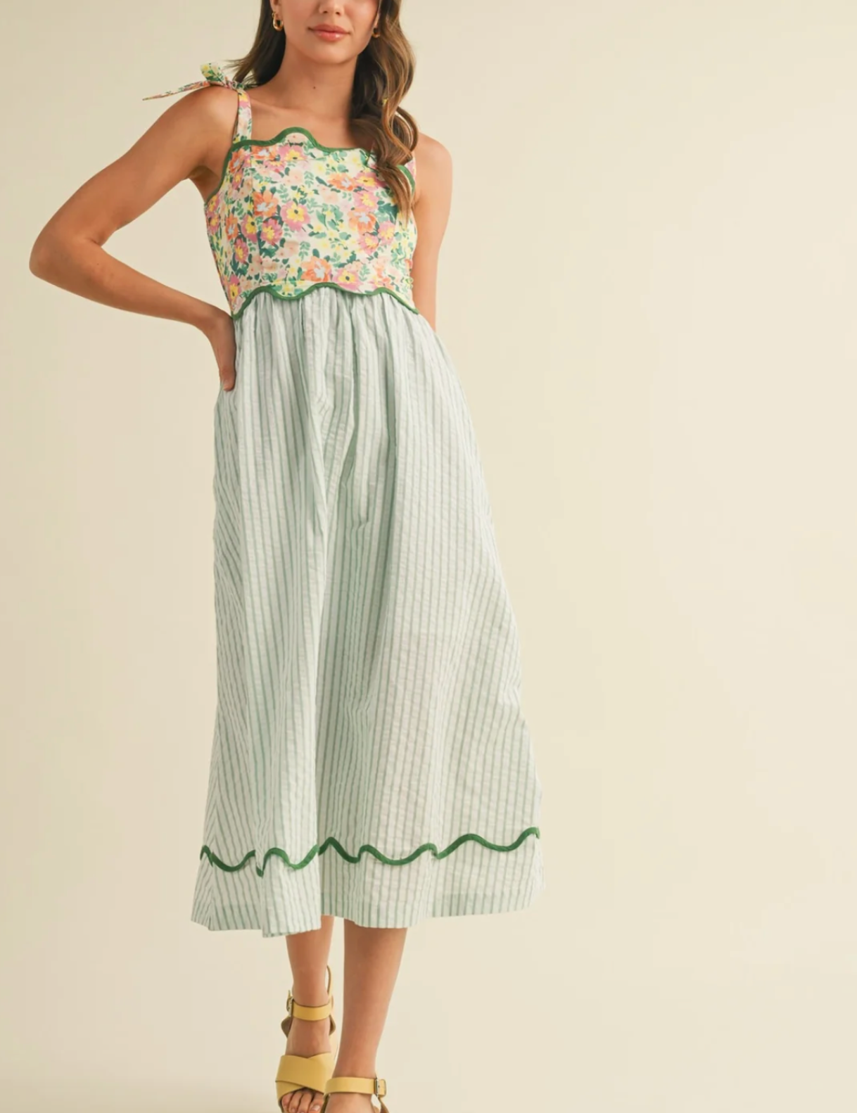 Elevate your wardrobe with our stunning Scalloped Mixed Print Midi Dress! This beautifully designed dress features a unique combination of patterns that perfectly blend style and comfort.