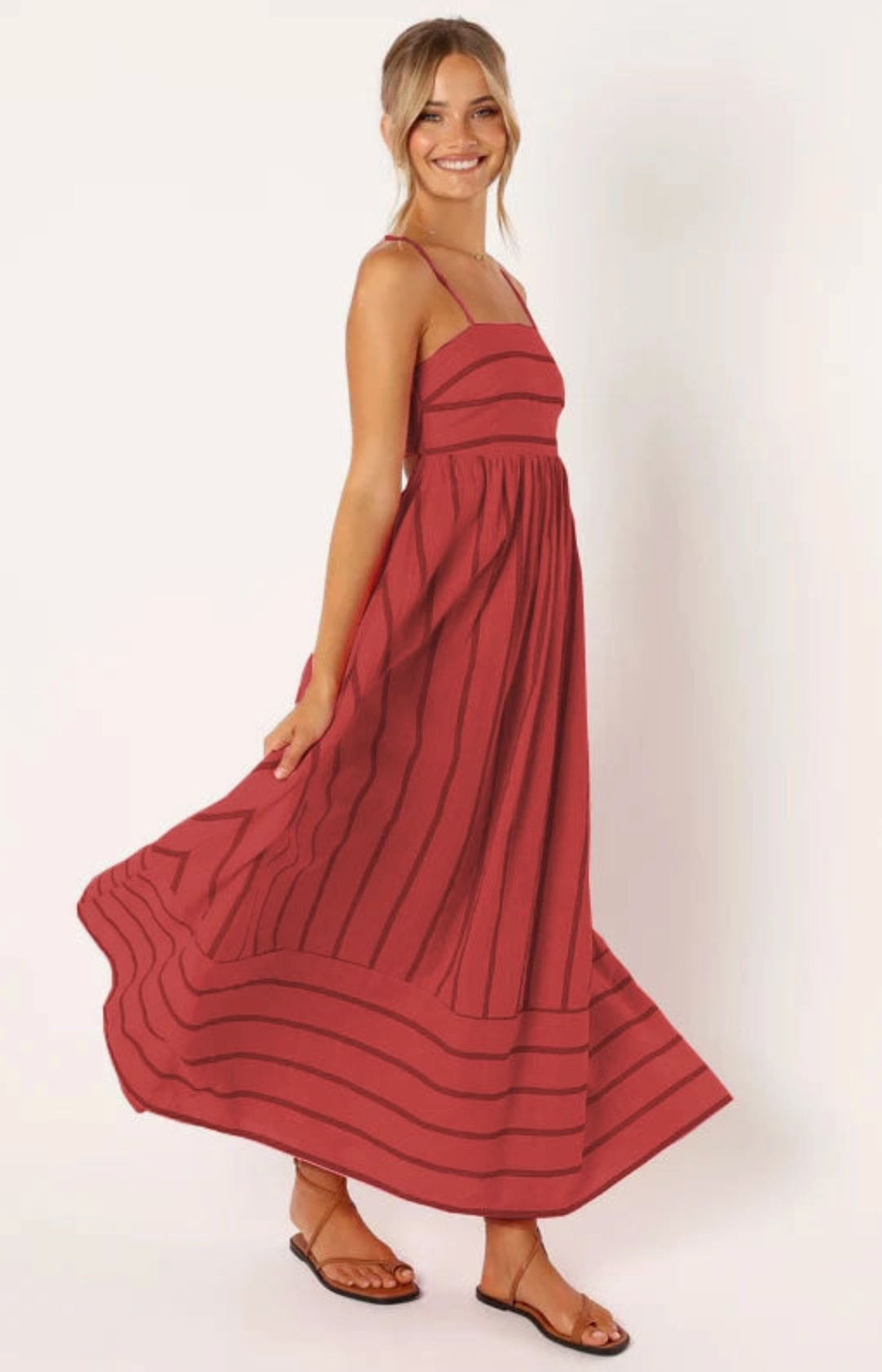 Whether you're dressing up for a night out or attending a summer wedding, the Striped Color Block Backless Spaghetti Dress is your go-to choice for effortless elegance.