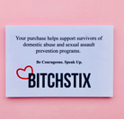 Formulated with skin-loving ingredients such as nourishing coconut butter, shea butter, and a refreshing hint of vanilla mint, these lip balms are a perfect blend of care and color. Experience the ultimate lip care with Bitchstix lip glazes, where beauty meets protection, leaving your lips soft, smooth, and glowing. Wear BITCHSTIX Lip Glazes everyday for a perfectly gorgeous pout! Perfect for gift giving! BE COURAGEOUS. SPEAK UP. Your purchase helps support survivors of domestic abuse and sexual assault