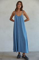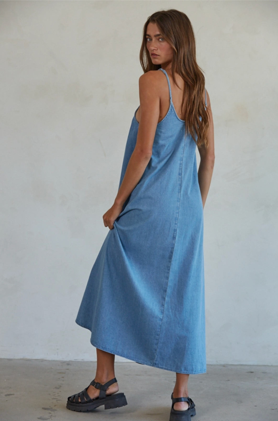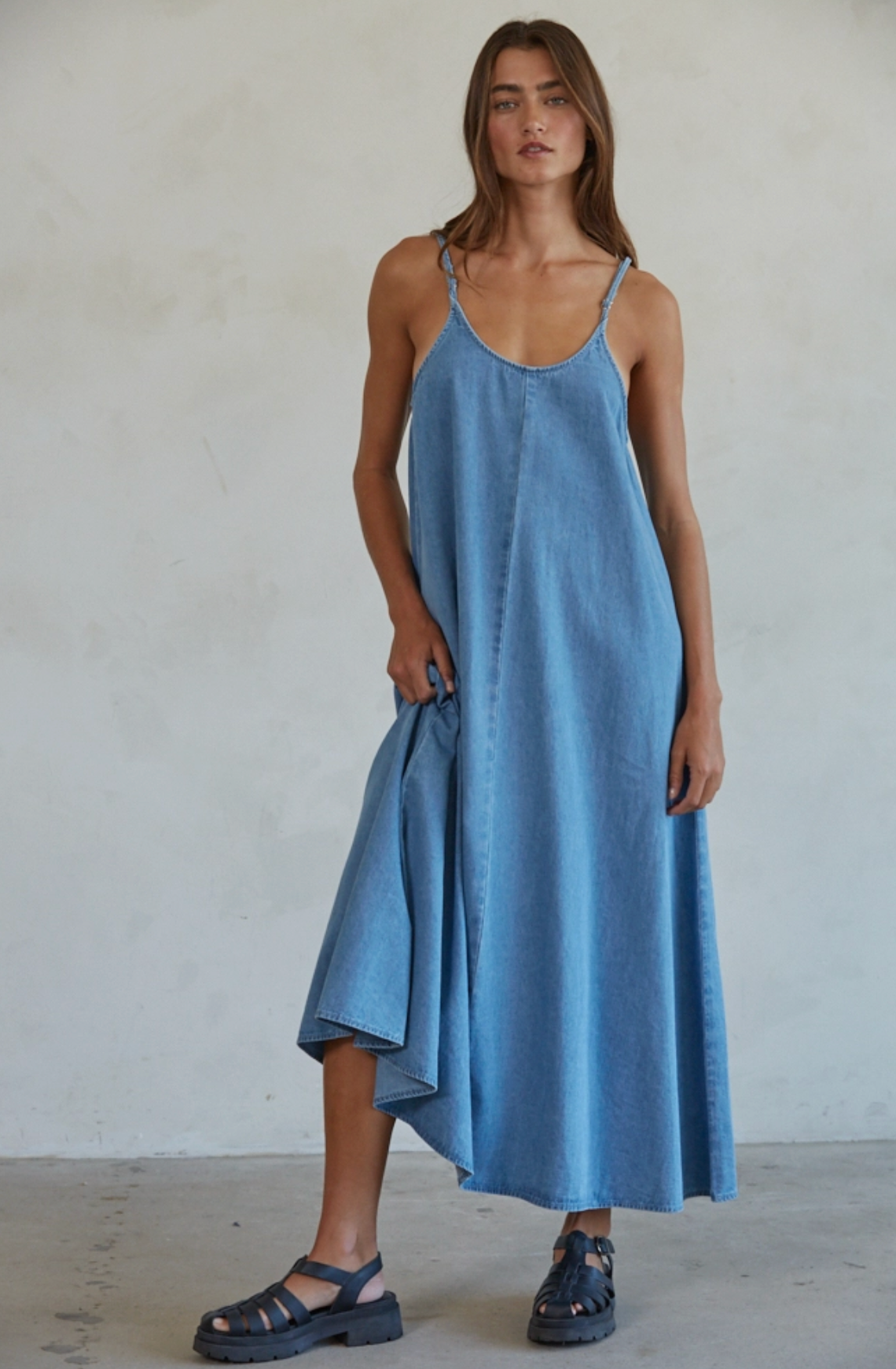 Woven Denim Scoop Neck Spaghetti Strap Flare Maxi Dress (No Lining)