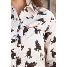 Saddle up in style with the Women's Cruel Bronc Button Down shirt. Designed specifically for rodeo queens, this stone-colored shirt features a bronc silhouette on the back and is crafted with high-quality materials to keep you comfortable and fashionable while you take on the rodeo.