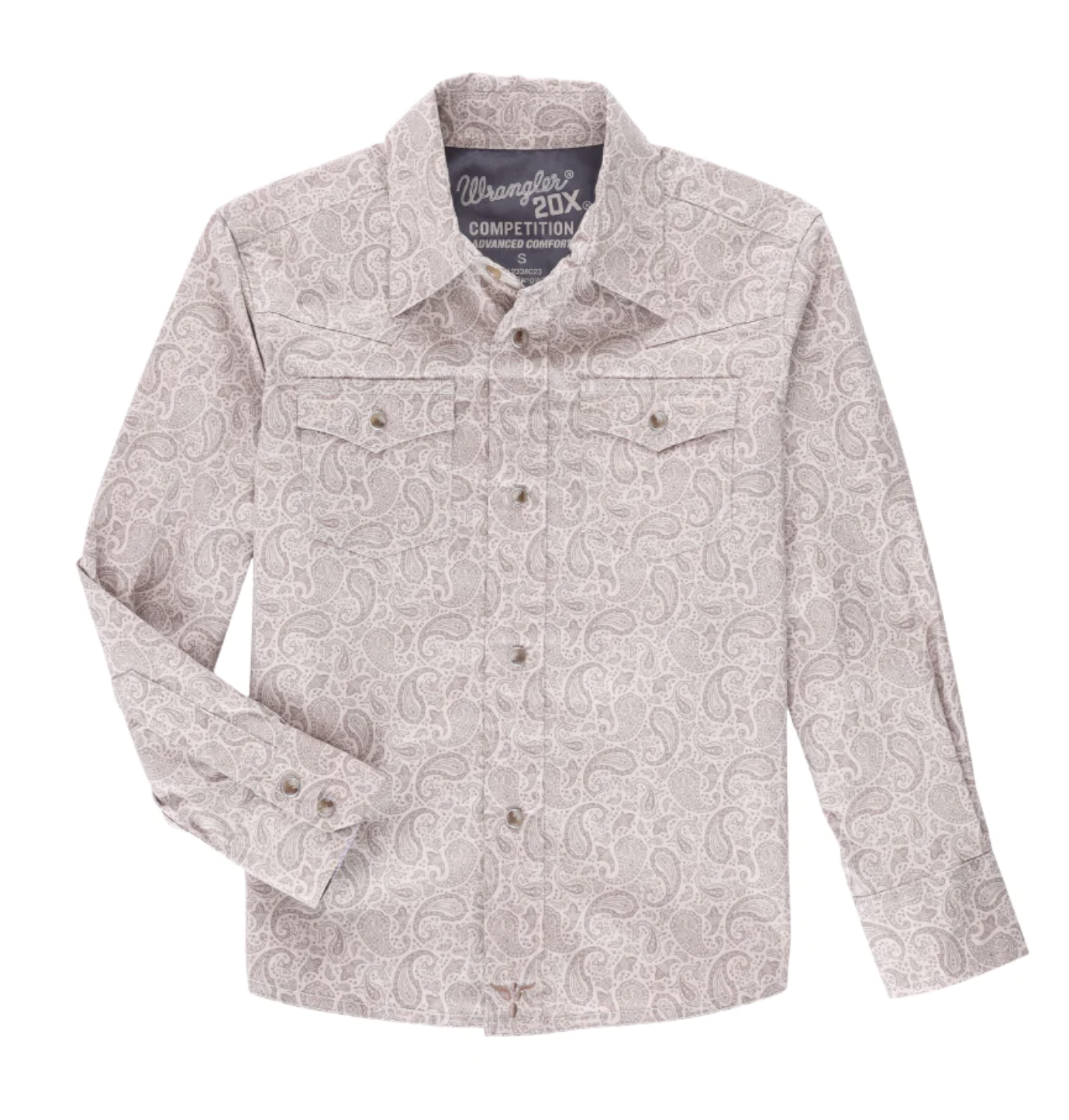 Essential Wrangler Boys 20X Western Shirt. Wrangler dresses them to take on the world. Traditional snaps make self-dressing easy while biased yokes, rancher's crease styling, snap flap pockets and contrast stitching add the cowboy charm.